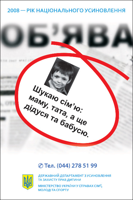 Міністерство України у справах сім’ї, молоді та спорту розпочало соціальну інформаційну кампанію на підтримку національного усиновлення. Перші 400 плакатів з дитячим закликом: "Шукаю маму і тата, а ще дідуся та бабусю" будуть розміщені на сіті-лайтах в різних містах України.