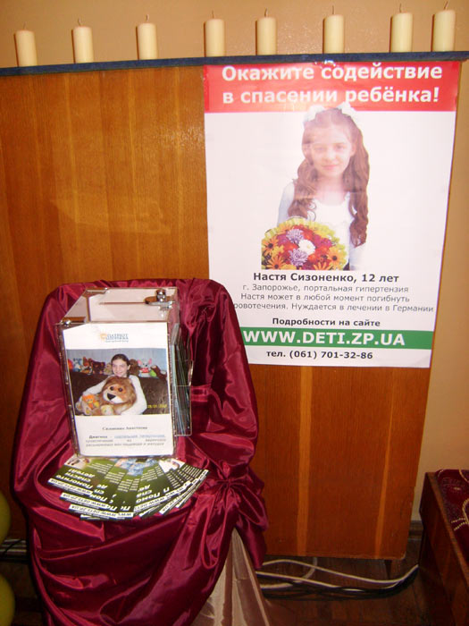 Действительно для каждого, ведь за 100 грн можно было приобрести билет на бал и сделать свой непосредственный благотворительный взнос в размере этой суммы. В этом году представителей фонда "Счастливый ребенок" снова пригласили на бал в качестве почетных гостей. Было выделено специальное место, где мы разместили плакаты с информацией о двух тяжелобольных детях Запорожской области - Настеньке Сизоненко и Владике Тихонове, и ящики для сбора пожертвований на лечение этих ребят.