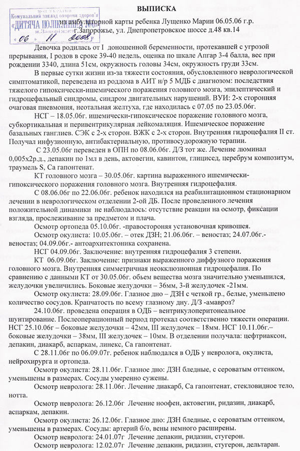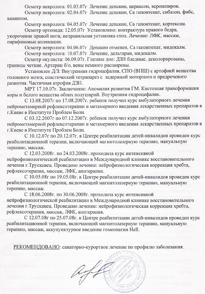 После выписки потянулась череда всевозможных реабилитационных отделений, устрашающих диагнозов и прогнозов. Установлен диагноз: Атрофическая гидроцефалия с грубой задержкой психомоторного развития. Частичная атрофия зрительных нервов. Спастический тетрапарез. Симптоматическая фокальная эпилепсия.