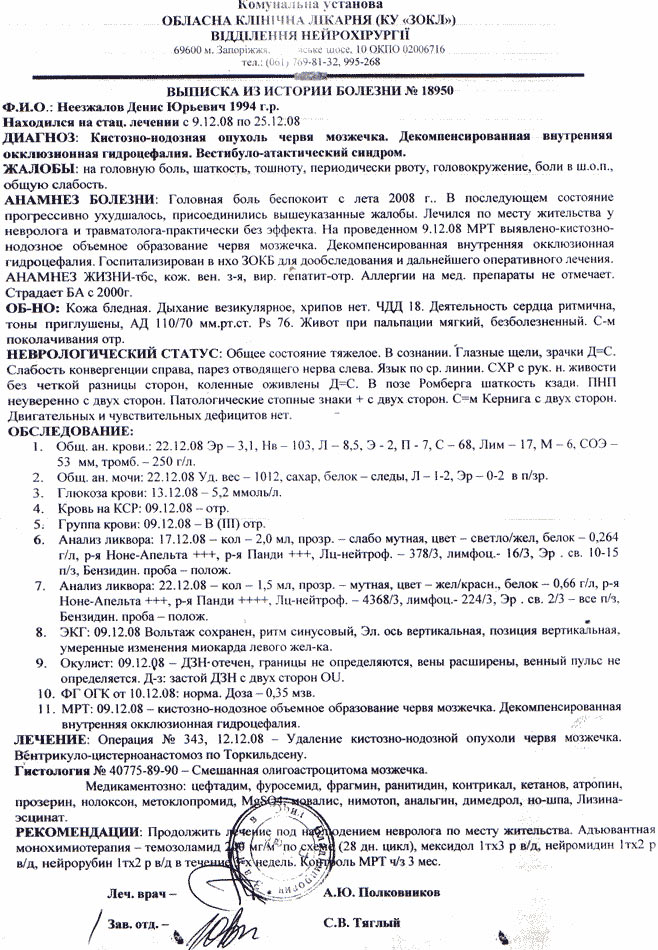 Летом 2008г., старший сын, Дениска, вдруг почувствовал себя плохо: стал жаловаться на головные боли, к которым затем присоединились общая слабость, тошнота, рвота, головокружение. Родители обратились к неврологу и травматологу по месту жительства, но лечение эффекта не имело, а состояние мальчика стремительно ухудшалось. 9 декабря Денису было сделано обследование на магнитно-резонансном томографе, которое выявило наличие кистозно-нодозного объемного образования червя мозжечка. Мальчик был срочно госпитализирован в Запорожскую областную больницу, где 12 декабря ему удалили опухоль. Операция по удалению новообразования на мозге продолжалась 7 часов, прошла успешно, но, к сожалению, в труднодоступном для оперативного вмешательства месте на стволе головного мозга остался маленький очаг опухолевых клеток. После операции прошло уже 2 недели, но общее состояние Дениса тяжелое, мальчик не может двигаться без помощи родителей.