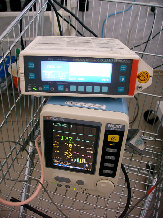 Кардиомонитор (нижний прибор) - самая большая ценность отделения, аппарат в единственном экземпляре. Прибор вверху - пульсоксиметр, также единственный в отделении