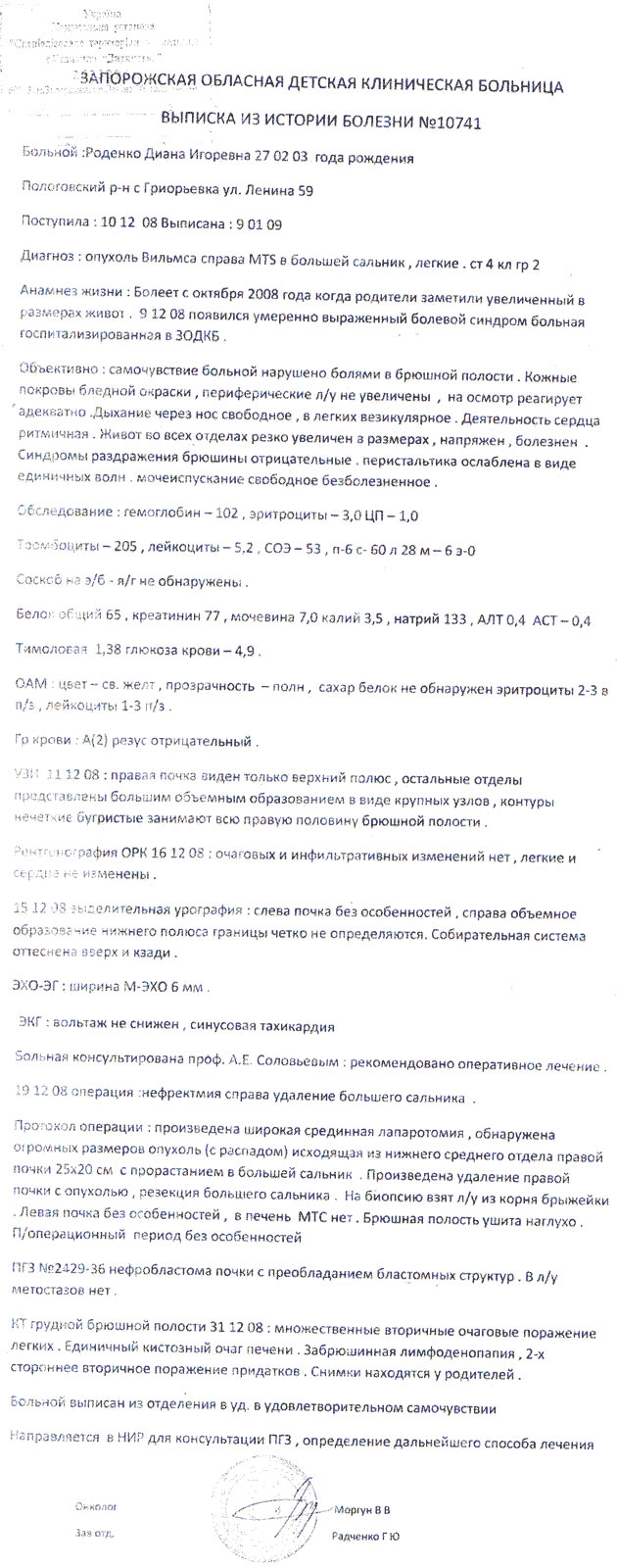 Осенью 2008г. у Дианочки начал увеличиваться в размерах живот. В декабре появился болевой синдром, и ребенка госпитализировали в Запорожскую областную детскую клиническую больницу. После проведенных исследований у девочки была обнаружена опухоль правой почки огромных размеров. Диане провели операцию по удалению почки с опухолью.