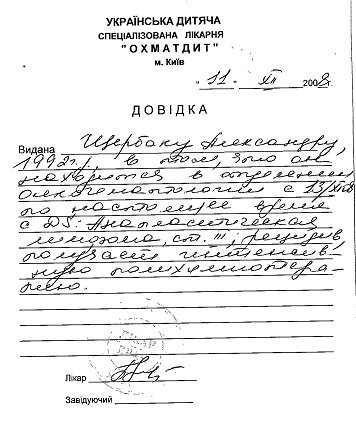В настоящее время в г.Киеве в больнице ОХМАТДЕТ проходит лечение наш с вами земляк - Саша Щербак из Мелитополя. У него рецидив апластической лимфомы, который случился через два года после окончания первого курса лечения. В 2006 г. Александру впервые диагностировали апластическую лимфому, были поражены лимфоузлы гортани, неба, грудной клетки и селезенки и с октября 2006 г. по март 2007 г. Саша проходил лечение в Охматдете. Тогда ему было проведено 6 блоков химиотерапии.