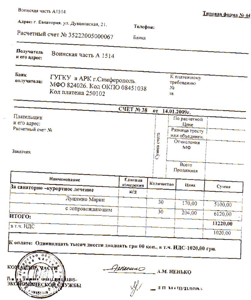 Счет на оплату санаторно-курортного лечения для Лущенко Марии