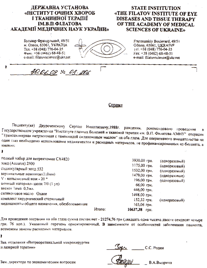 Нами был получен счет на операцию из Одесского Института глазных болезней им.Филатова, в котором указана стоимость медикаментов и расходных материалов для операции Сергею Двуреченскому. Цены в данном документе указаны по состоянию на сегодняшний день. На данный момент эта сумма составляет 21 274 грн. 76 коп.: