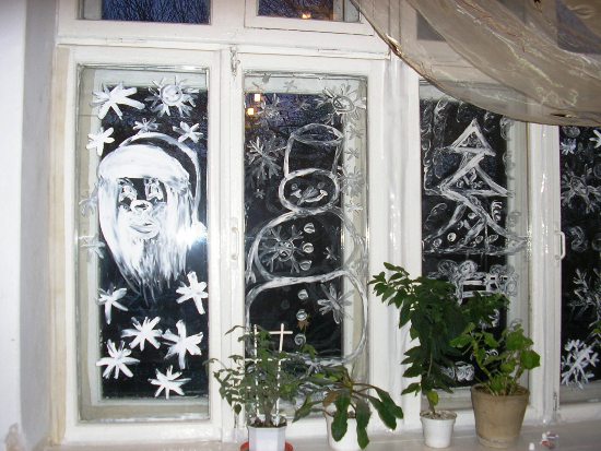Дальше уже начинаются первые дизайнерские наработки: к Новому году ребята сами украшали свои кабинеты, разрисовывая окна,