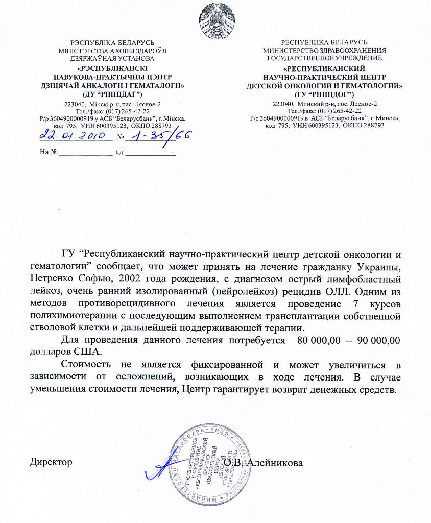 Белорусский научно-практический центр детской онкологии и гематологии - как раз такая клиника, процент выживаемости после лечения лейкозов в данной больнице достаточно высок. Мама Сонечки созвонилась с центром - свободные места есть, клиника готова принять ребенка прямо сейчас. Если бы не одно НО: как для гражданина другого государства лечение для украинского ребенка в зарубежной клинике осуществляется не бесплатно и составляет несколько десятков тысяч долларов:
