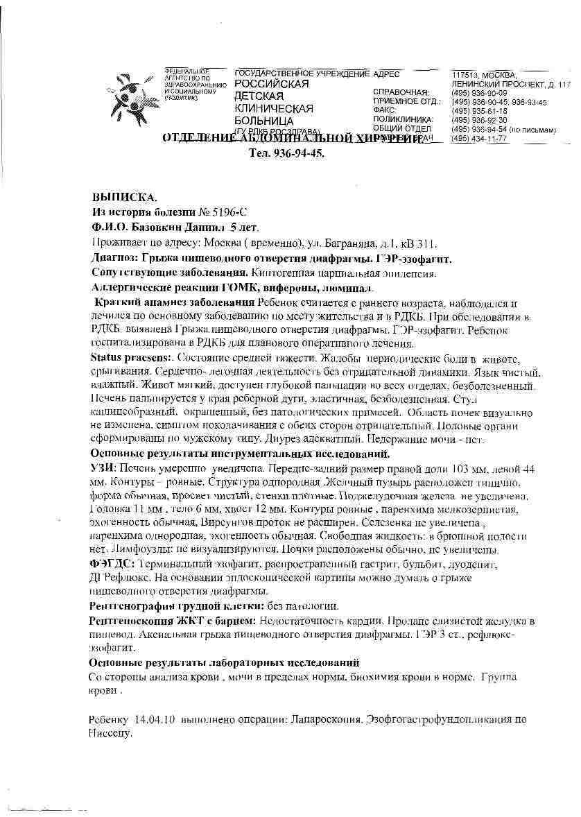 И вот, наконец-то, после нескольких месяцев ожидания, болей и страданий, которые терпел этот ребенок, 14 апреля 2010 года Данечку прооперировали в московской клинике РДКБ. Перед операцией врачи провели полное обследование и констатировали, что состояние ребёнка ухудшилось по сравнению с прошлым годом, грыжа значительно увеличилась. Сказали, что сейчас операция будет как раз вовремя, так как если бы грыжа увеличилась и дошла до горла, то ребёнок просто не мог бы воспринимать совершенно никакую пищу.