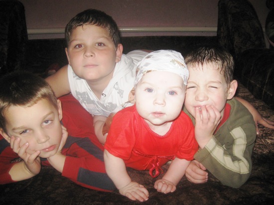 Представляю вам счастливых обладателей 3 замечательных сыночков и одной лапочки-дочки, семью Полонниковых: Руслан (8 лет), Витя (5 лет), Кирюша (4 года) и Маргаритка (8 месяцев), мама Полонникова Юля и папа (в кадре не присутствует, так как фотографирует).