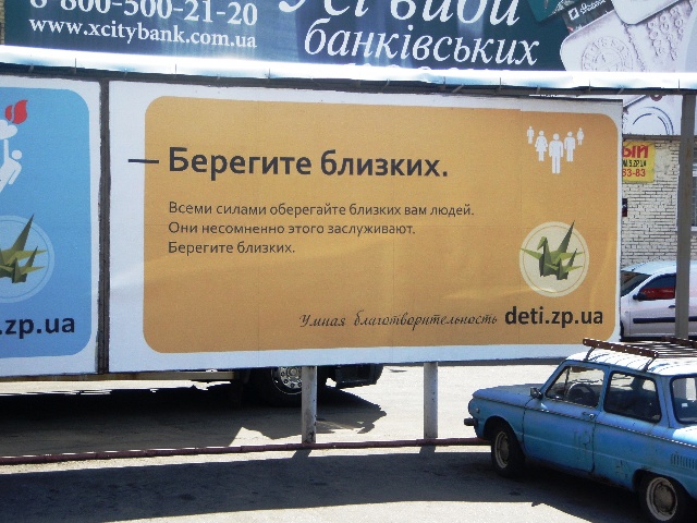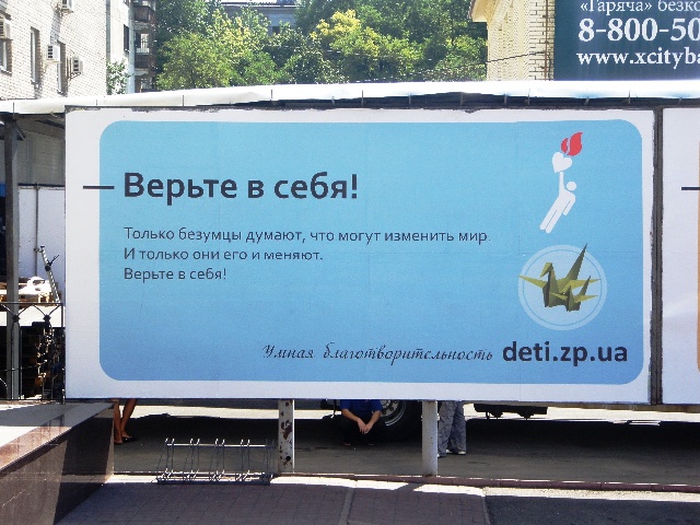 На автостоянке перед универмагом «Украина» появилась необычная реклама. Необычна она тем, что не призывает ничего покупать, не информирует о скидках, да и вообще ничего не просит для себя. Напротив, она «отдает», призывая людей верить в себя, быть добрее, ценить семью и любить своих детей.
