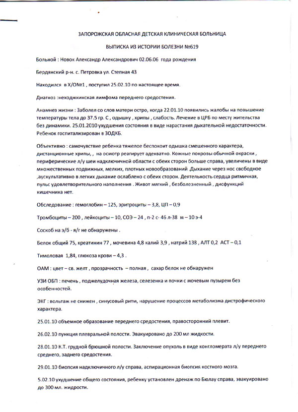 Сашенька рос здоровым ребенком и ничто не вызывало тревоги у мамы. В январе 2010 года мама обратила внимание, что у Саши увеличен лимфоузел и обратилась в больницу города Бердянска, где и было назначено лечение. Через 7 дней Саше стало хуже. Еще раз прошли обследование в той же больнице. В ходе обследования врачи обнаружили, что в легких малыша скопилась жидкость. С подозрением на туберкулез их направили на лечение в Запорожскую областную детскую больницу. В г.Запорожье диагноз не подтвердился, а оказалось, что у малыша серьезное заболевание крови – Т- клеточная лимфома.