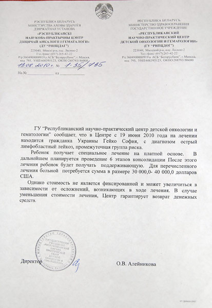 На сегодня состояние ребенка улучшилось, приступили к реиндукции – стандартной химиотерапии второй линии, вследствие чего (большие надежды) должна наступить полная ремиссия. Малышка маленькими, но уверенными шагами идет к выздоровлению, по последним исследованиям раковые клетки не растут. Зато растет счет на оплату медицинских услуг в Белорусской клинике. Нужно внести 5000 долларов до октября этого года, а затем остальные 15 тысяч долларов до февраля 2011 года.