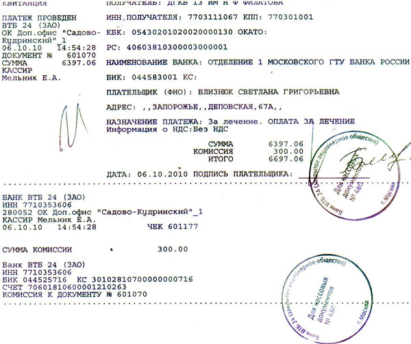За месяц до операции нашими жертвователями было собрано 2849,05 гривен на проезд и дополнительные расходы, а также оплачен основной счет на лечение в Москве на сумму 44 779 русских рублей (11 514.32 гривен).