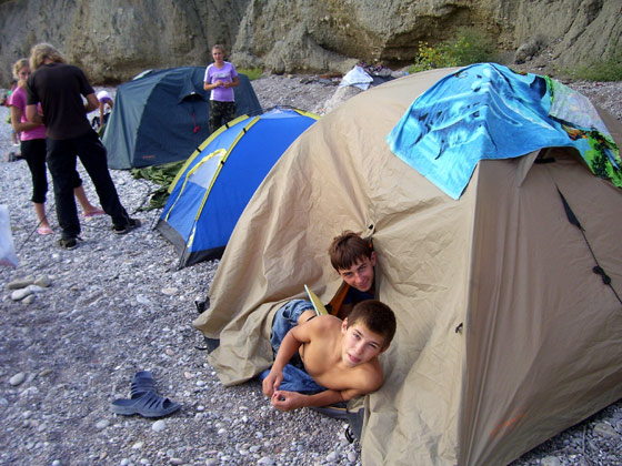 На следующий день к обеду мы вышли на ялтинскую трассу. Бог послал нам пустой автобус, вся группа из 22 человек отправилась к бухте Ласпи. Мы остановились рядом с детским оздоровительным центром, палатки разбили прямо у моря. Дети с удовольствием купались и грелись на солнышке, а вечером мы были очевидцами прекрасного салюта, который был организован на закрытие Д.О.Ц. «Ласпи». Но детям казалось, что салют устроен в честь нашего прибытия! Огромные гирлянды разных цветов вспыхивали прямо над нашими головами, зрелище было завораживающее! Спать никому не хотелось, и дети сидели возле своих палаток, слушая шум ночного прибоя и любуясь лунной дорожкой.