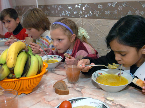 Некоторые родители просят принять ребенка в интернат, потому что... здесь красивее стены, вкуснее и сытнее кормят, чем дома или в обычной сельской школе... В интернате продолжается ремонт, уже отремонтированы спортивный и актовый залы, столовая, уборные, часть спального корпуса, оборудуют компьютерный класс, дети бесплатно посещают бассейн неподалеку, кружки, концерты, сюда часто приезжают спонсоры с подарками, известные люди, чиновники и политики... На питание одного ребенка выделяется более 38 гривен в день. В день нашего приезда на обед в интернате было: борщ со сметаной, курка с гречкой, кабачковая икра, квашеные помидоры, сало с хлебом и чесноком, сок, апельсины. Хотя сочетание чеснока с апельсином показалось довольно странным, но так борются с простудами и гриппом. Повара рассказывают: когда первого сентября все дети получили подарки от спонсоров, то сироты раздаривали сладости учителям и воспитателям, угощали друг друга, а «домашние» прятали, чтобы потом отнести домой.