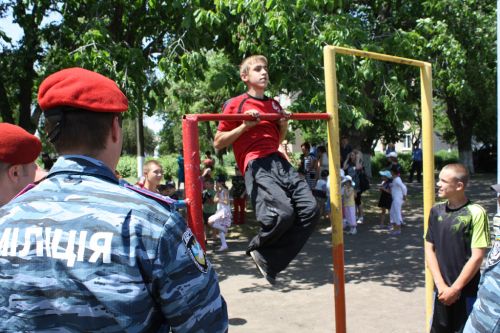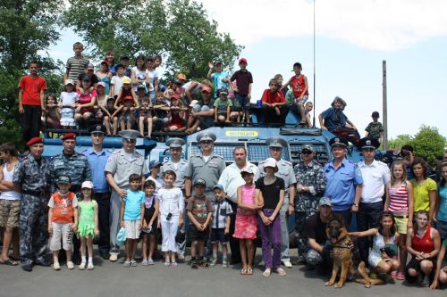 Затем бойцы «Беркута» устроили среди ребят конкурс, в программе которого было подтягивание на перекладине, упражнения на гимнастических снарядах и эстафета с автоматом. Трое победителей получили из рук командира спецназовцев Юрия Калмыкова почетные грамоты. А дальше всех желающих катали на бронетранспортере.