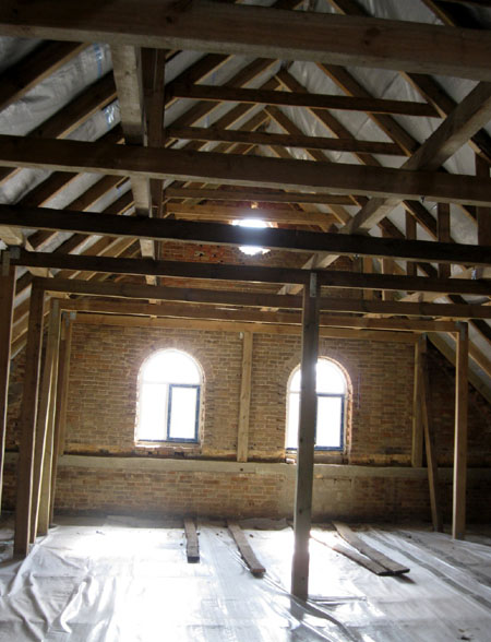 Сейчас работы идут полным ходом – строители завершают укладку «тёплых полов», реконструируют крыльцо здания, делают обшивку пола в чердачном помещении, подготавливают систему подключения электроэнергии.