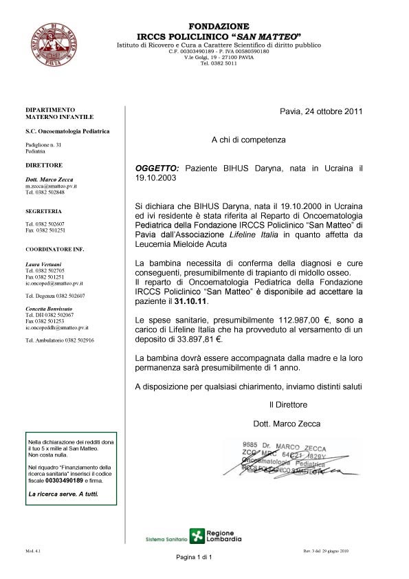 После двух блоков стандартной химиотерапии стало понятно, что организм Дарины не отвечает на это лечение, болезнь не поддается (первичная резистентность к стандартной химиотерапии). В связи с этим главный детский гематолог Украины С.Б.Донская дает заключение о необходимости проводить аллогенную трансплантацию костного мозга от неродственного донора за пределами Украины.