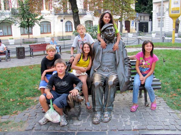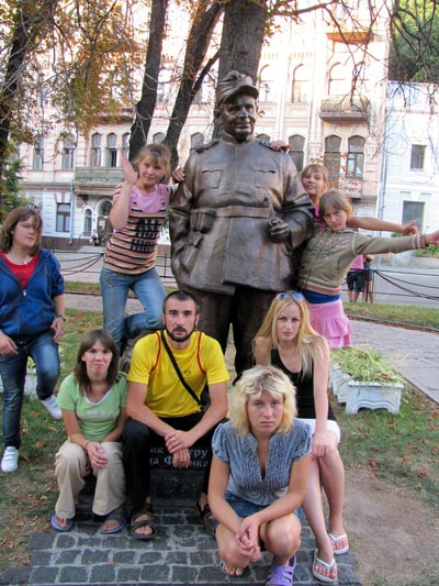 Ребята вместе с Антоном Бондаренко и Юлией Ахтман у памятника основателю Национального академического драматического театра им. Ивана Франко - Гнату Юре