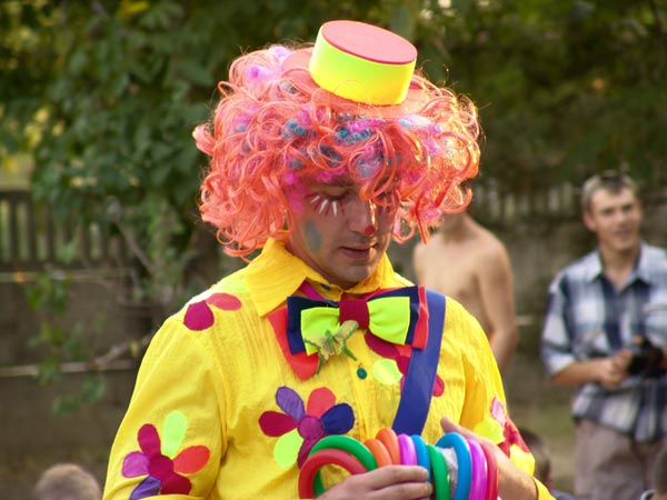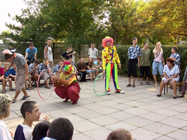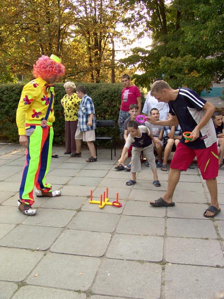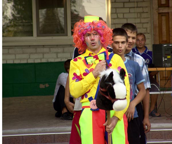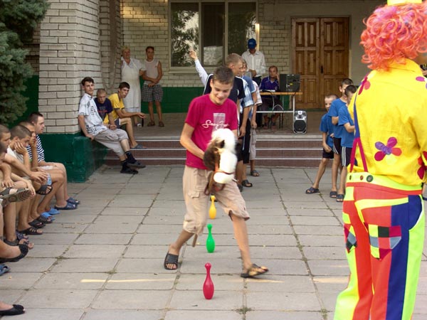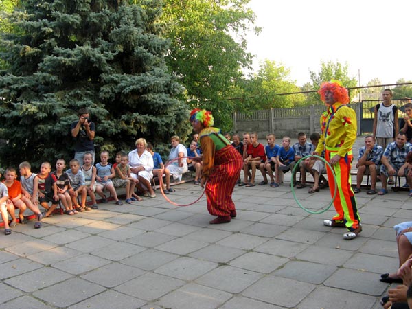 Клоуны развлекали ребят забавными игрушечными лошадками, мячами, пластмассовыми детскими обручами и кеглями. Артисты танцевали вместе с детьми, и весь вечер дарили им незабываемое весёлое праздничное настроение.