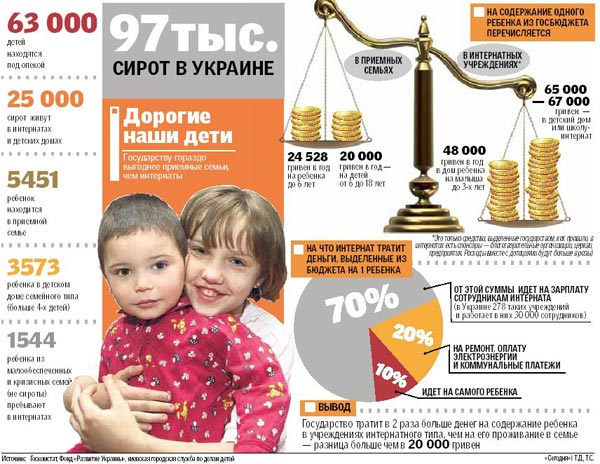 В год на одного воспитанника интерната государство выделяет в среднем 65 тысяч гривен. Всего в интернатах 25 тысяч сирот. Умножаем и выходит , что в среднем из бюджета в год расходуется больше миллиарда гривен на содержание детей-сирот. Но если бы эти деньги действительно шли на детей! По данным Киевской Службы по делам детей, из этой суммы на сироту тратится около 12%. Большую часть денег съедают сотрудники интернатов: 70% идет им на зарплаты. Оставшаяся сумма уходит на содержание здания и «коммуналку». А интернаты у нас строились еще при Советском Союзе, с размахом — минимум на 150—200 детей, а есть и на 600! Содержать такие «особняки» — непростая задача для руководителей. И решить ее можно, только наполнив пустующие койки детьми. Именно поэтому интернаты сейчас стараются забрать детей из малообеспеченных и кризисных семей, а тех детей, которые у них, ни в коем случае не отдавать в семью.