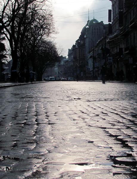 Отражение декабрьского неба в мостовой Проспекта Свободы