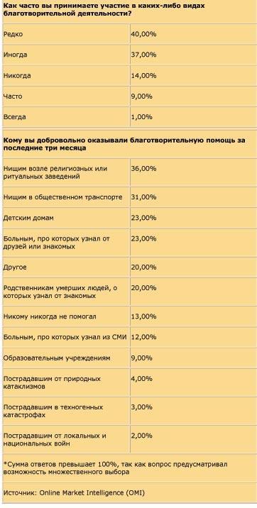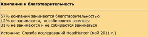 Очень многие компании, как, к примеру, Hospitality In.Comm, помогают детским домам. "Мы сторонники прямого взаимодействия, помощи без посредников, так как даже те небольшие суммы, которые получает специализированная компания, намного эффективней будут использованы внутри самого учреждения, получающего помощь", - уверена Наталья Розенблюм, партнер Hospitality In.Comm. Другой крупный фонд - "Созидание" - для "Серебряного дождя" собирал средства детям Беслана, участвовал в программе помощи пострадавшим от аварии на Саяно-Шушенской ГЭС. Это самый крупный фонд помощи малоимущим семьям (тысячи посылок каждый год). Кстати, "Созидание" один из немногих фондов, не берущих 20% со сборов на свою деятельность.