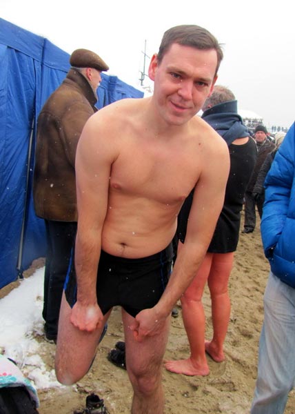 Как вы уже видели в ролике - особенно порадовали в этот день ребята из "СПАСа". Учитель и тренер ребят - Александр Грицай готовится к купанию!