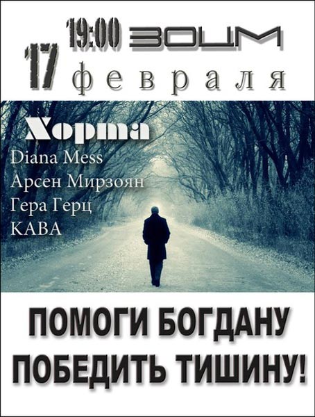 17 февраля в 19.00 в Запорожском областном центре молодёжи и студентов (ул. Патриотическая, 49) состоится благотворительный концерт в помощь Богдану Маринину, с участием Арсена Мирзояна группы "Хорта"...