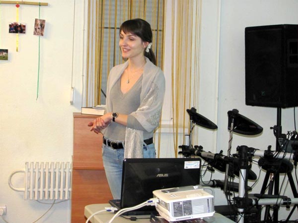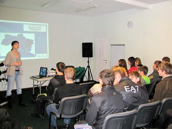 Вначале Алла рассказала о своей компании и о принципе работы мобильных линий. Затем рассказ пошёл о проектах «Киевстара». Из которых, пожалуй, самый интересный – это «Семейная лавка». Эта новая достопримечательность Днепропетровска появилась в прошлом году и сразу же стала место семейного отдыха и встреч молодёжи. Лавка представляет собой 50-метровую скамью и украшена семью коваными инсталляциями, которые отражают жизненный путь семьи: момент встречи двух сердец, влюбленность, решение быть вместе, появление детей, заботу и мир, а также главное, что соединяет членов каждой семьи - общение. Аналогов лавочке в Украине нет.