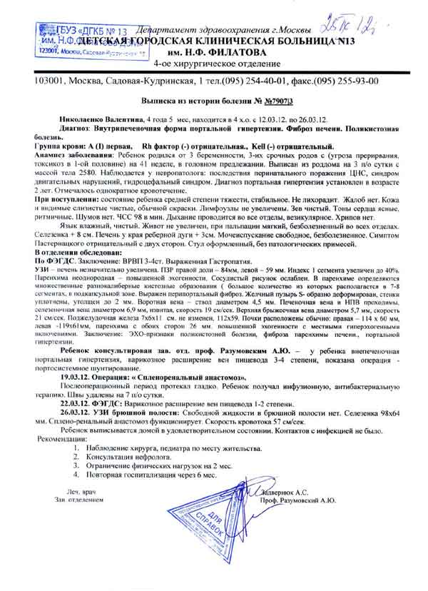 Семьи Слепцовых, Николаенко и Воробьевых благодарят врачей и весь персонал отделения торакальной хирургии Детской городской клинической больницы №13 им. Н.Ф. Филатова (г.Москва, Российская Федерация), на базе которого проводятся операции по формированию анастомозов детям с портальной гипертензией, а именно: