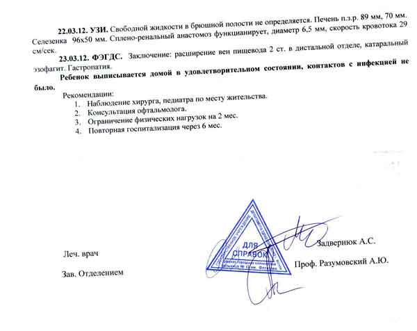 В ходе операций детям сформировали портальные анастомозы, функция которых - восстановление физиологического кровотока по воротной вене. Уникальность этих операций заключается в полном восстановлении физиологических и анатомических соотношений в воротной системе и полное устранение угрозы кровотечений из варикозных вен пищевода. Таким образом, прежде тяжело больные дети с синдромом портальной гипертензии превращаются в практически здоровых.