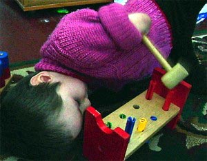 Видели бы вы, как изобретательно и целеустремленно он играет со своими игрушками. На фото справа он забивает пластиковые колышки, а на видео ниже управляется с мелком и бумагой.