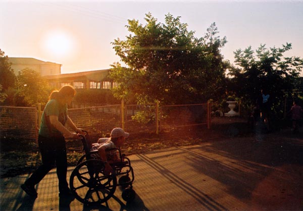 Дети, которые могут ходить, помогают тем, кто не может передвигаться самостоятельно. Не каждый ребенок сумеет управлять инвалидной коляской достаточно ловко, чтобы не застрять в узких местах. Саша особенно ответственный и добросовестный. Он везет коляску с Алешей как заботливый старший брат.