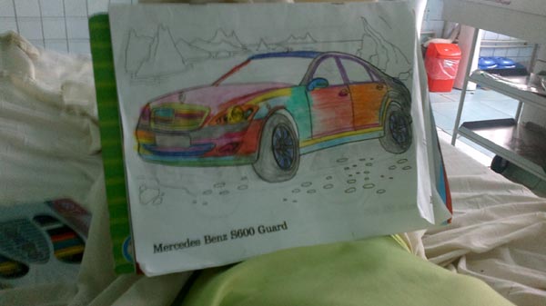 Несмотря на тяжелое состояния, Кирюша находит в себе силы заниматься любимым делом: автомобиль получился очень жизнерадостным!