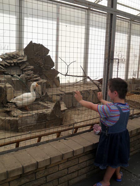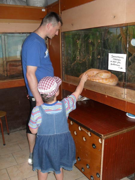 Но вершина взята! Перед нами уже первая клетка - с «больной собакой» - так дети называют лису, которая мечется по своей клетке без остановки. Кроме лисы, на улице в вольере живут енот и кролики. А вот Катю больше всего привлекают домашние птицы – она снова и снова подходит к клетке с гусем. Вообще Катя оказалась самым большим любителем зоологии: ей нравятся и маленькие и большие рыбки, и большущие змеи, на которых мы, взрослые, не всегда готовы смотреть без страха.