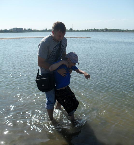 Вот такой вот шаг пытается самостоятельно сделать маленький Олег и внезапно он уже на спине барахтается в воде. Вовремя помогает Олегу наш волонтер Виталий, и мальчик не успевает испугаться, – он идет с нами в море снова и снова. Все-таки радости у нас всех одинаково простые – и у особенных детей, и у обычных, и у взрослых.