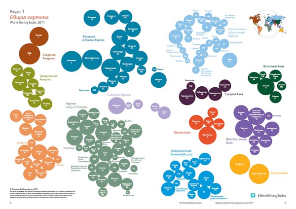 Однако не все так оптимистично: рост благотворительной активности в мире фактически объясняется тем, что люди стали больше непосредственно и прямо помогать нуждающимся и заниматься волонтерством. Это продолжение прошлогодней тенденции: в 2010 году по сравнению с 2009 в мире также выросло число волонтеров. Количество же и общая сумма денежных пожертвований в благотворительные организации в 2011 году сократились. Количество тех, кто оказывает помощь нуждающимся непосредственно возросло на 2%, а волонтеров – на 1%. А количество респондентов, которые ответили, что в течение последнего месяца пожертвовали деньги благотворительным организациям, сократилось на 1%.