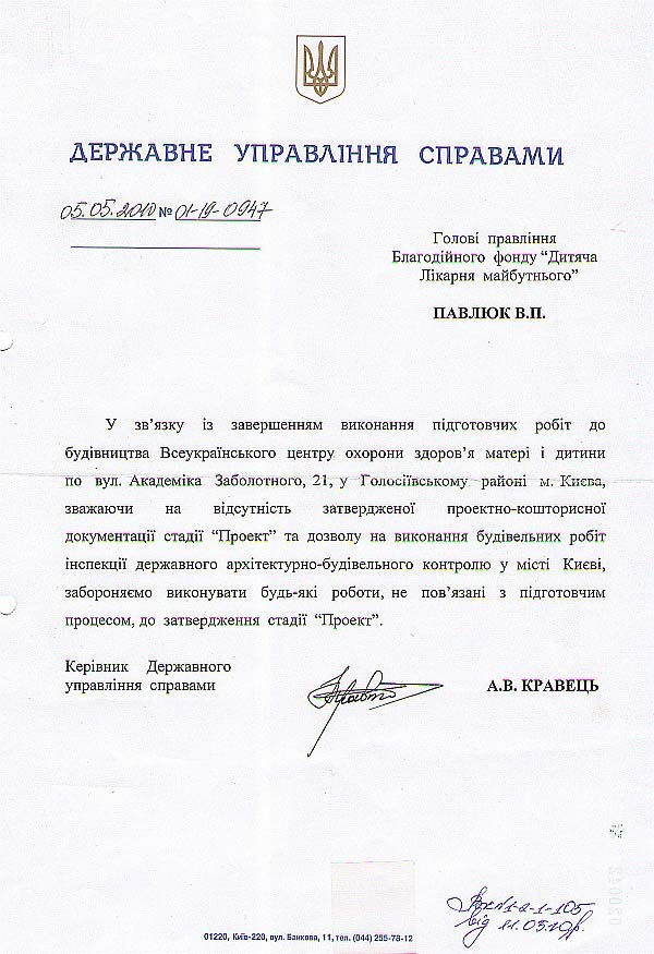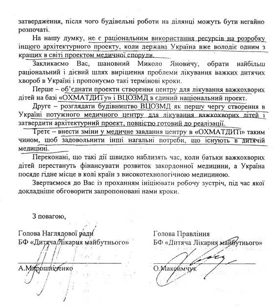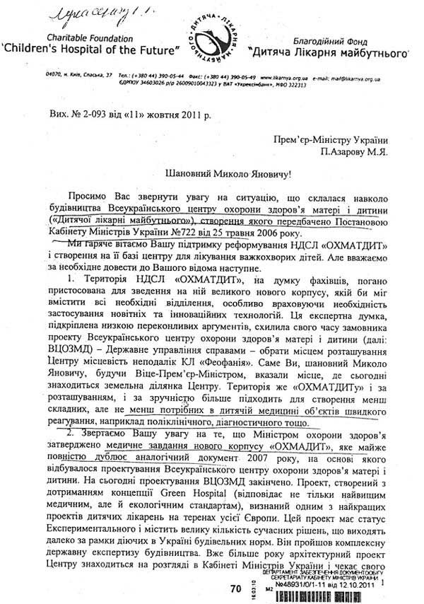 Восени 2011 року керівники Фонду звернулися з листом до прем’єр-Міністра Азарова, де розповіли про переваги проекту Всеукраїнського центру і запропонували об’єднати Центр і новий корпус "Охматдиту" в один загальнонаціональний проект. Ми дуже вдячні Миколі Яновичу, який побачив усі переваги Центру і розглядає можливість збудувати його.