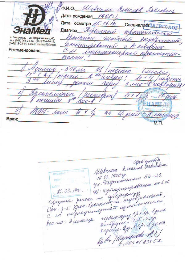 Медицинская выписка: 1 стр. 2 стр.