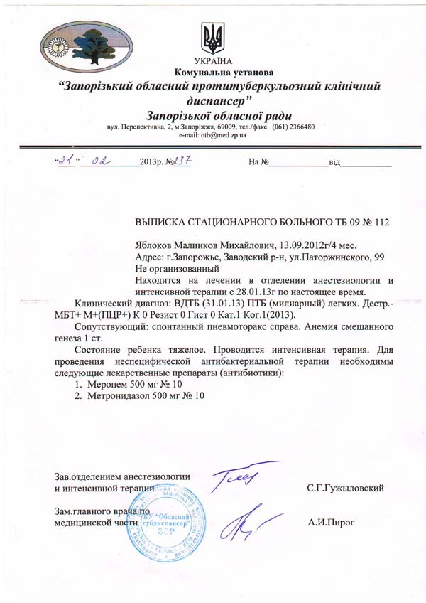 А в начале 2013 года у Малинкова внезапно поднялась температура и не снижалась несколько дней, мама забила тревогу, и малыша положили в ЗГДКБ №5. Анализы мокроты, рентген и другие обследования показали, что в организме имеются палочки туберкулеза. В тот же день кроху отправили в реанимацию Запорожского Областного Противотуберкулезного Диспансера. У Малинкова не прекращался кашель, температура не снижалась, ребенку назначили большой список лекарств, среди которых – «Риабал», «Меронем», «Метронидазол» и другие. В день у одинокой мамы уходит от 100 до 300 гривен на жизненноважные препараты для ребенка. Это огромные деньги для Эсмеральды, ведь она одна подымает на ноги своих деток.