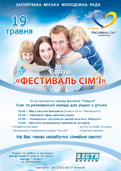 Для детей и их родителей, для будущих супружеских пар приготовлено множество интересных детских и семейных конкурсов, веселых спортивных состязаний, забавных конкурсов детского творчества, а также просветительские мероприятия. Все участники «Фестиваля семьи» в Запорожье гарантированно получат мощный заряд положительных эмоций, а победители конкурсов – памятные подарки и приятные сюрпризы.