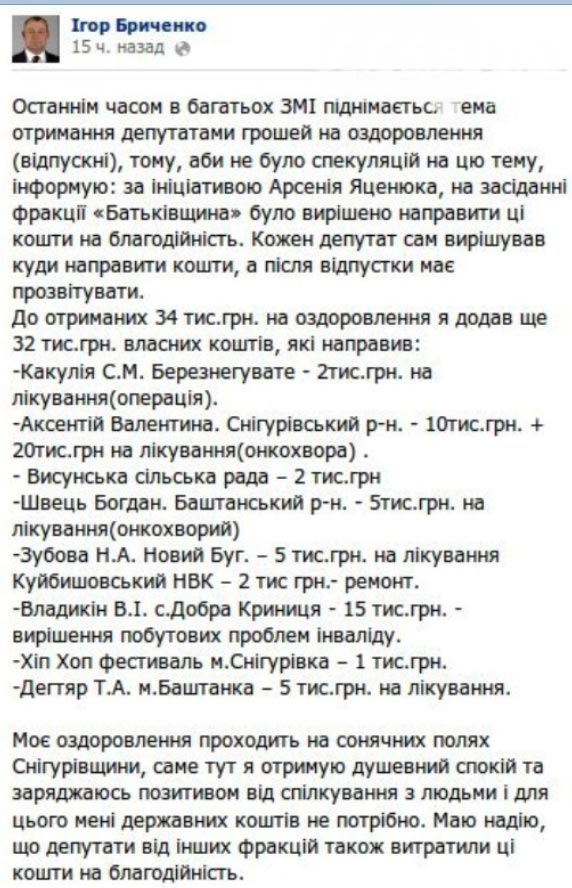 А некоторые политики уже готовятся к 15-му году. Так, николаевский нардеп-оппозиционер Игорь Бриченко на днях заявил во всеуслышание о том, что потратил на благотворительность 32 тысячи гривен из собственного кармана. О своем щедром жесте депутат сообщил на странице в FB, подробно описав суммы и их назначение: