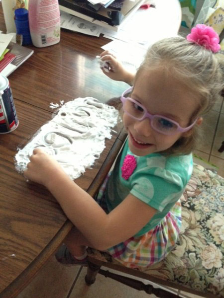 Полина пишет свое имя на «холсте» из пены для бритья