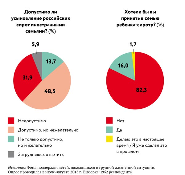 Руководитель фонда «Волонтеры в помощь детям-сиротам» Елена Альшанская считает, что проблему решить можно. Россияне готовы были бы взять в свою семью ребенка-инвалида, если поменять отношение к этому общества и государства: «Наши люди не хуже, чем американцы, итальянцы, французы, — уверена Альшанская. — Мы такие же сердечные, просто у нас нет этих условий, а государство эти условия, заметьте, не создает».