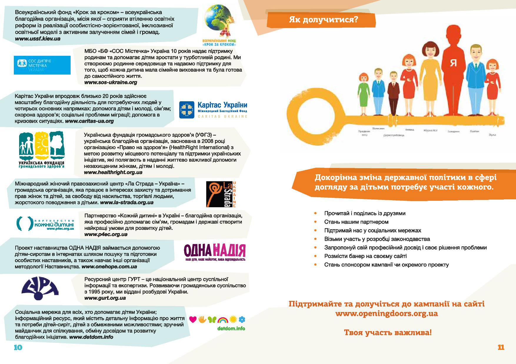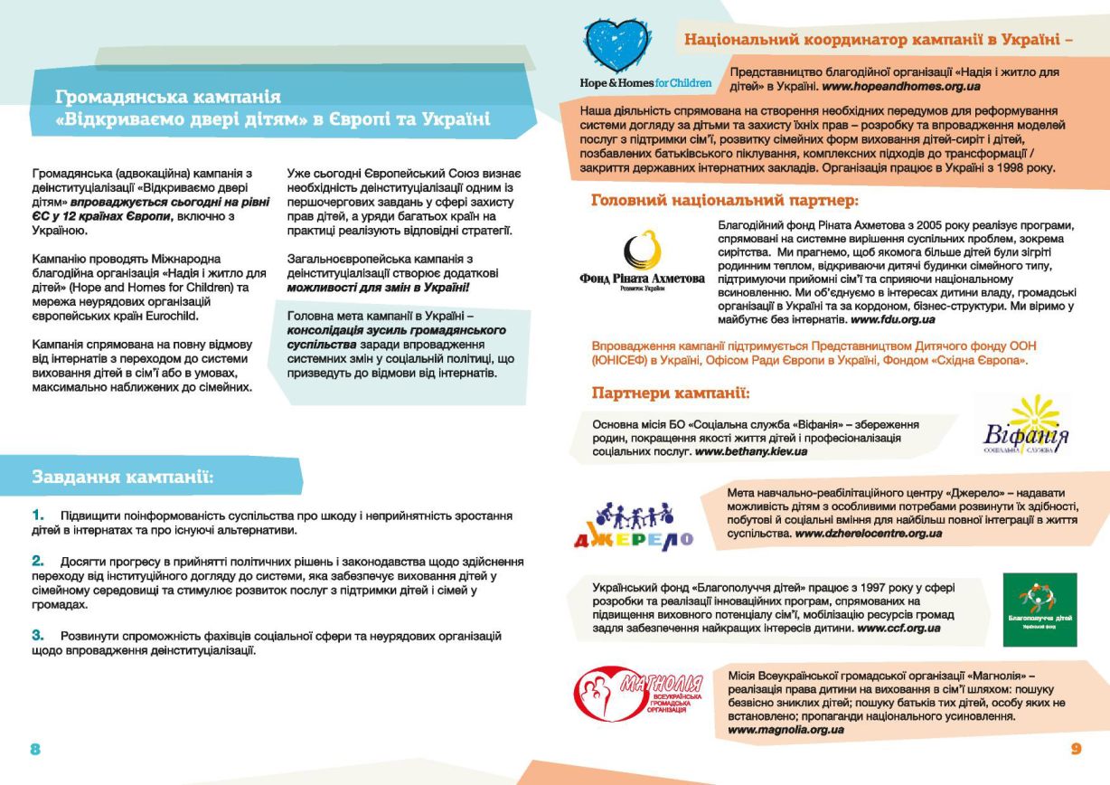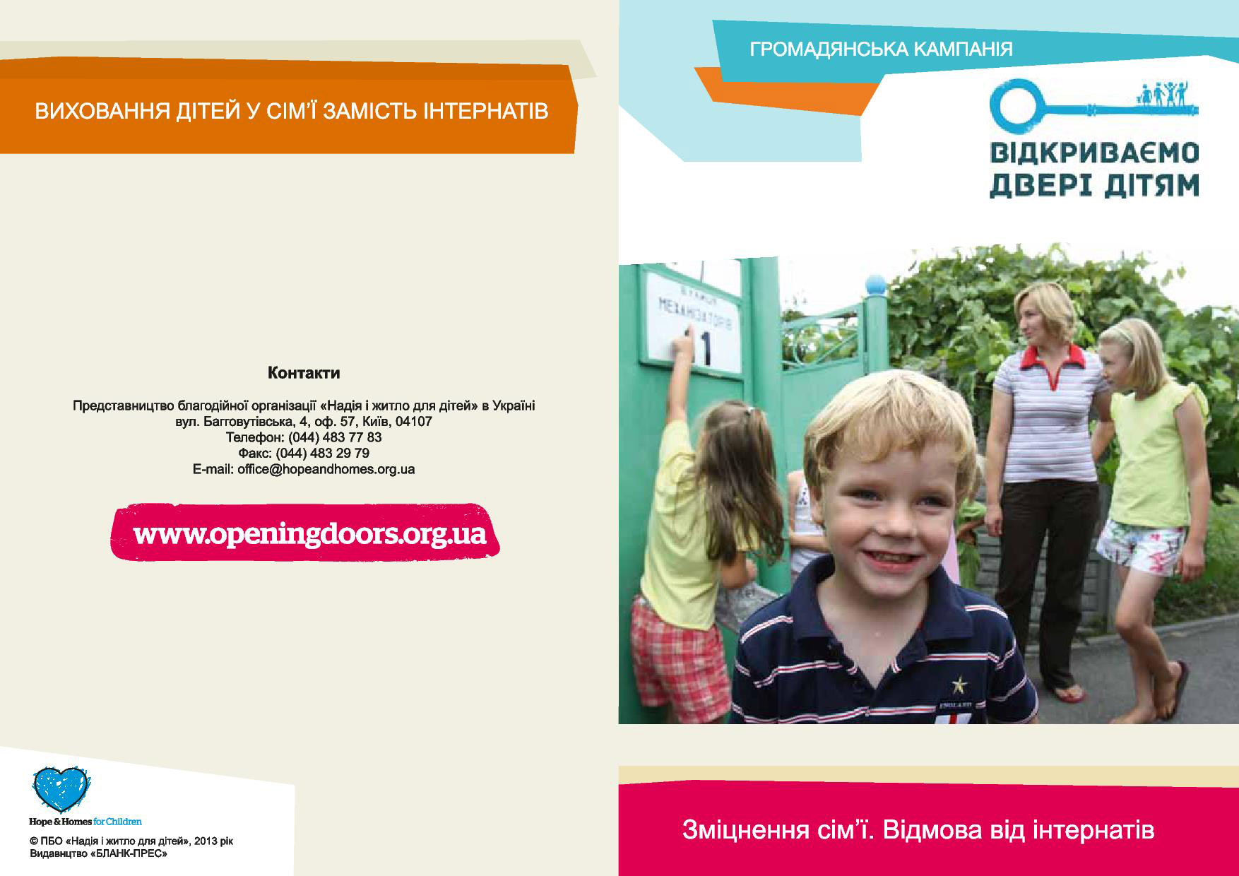 Адвокаційна кампанія деінституціалізації «Відкриваємо двері дітям Європи» впроваджується на рівні ЄС у 12 країнах Європи, включаючи Україну. Кампанія закликає ЄС і уряди європейських країн здійснити перехід від інституційної системи догляду дітей до виховання дитини в сім’ї. Кампанію проводять Міжнародна благодійна організація «Надія і житло для дітей» (Hope and Homes for Children) і мережа неурядових організацій європейських країн Eurochild Офіційний сайт кампанії – www.openingdoors.eu