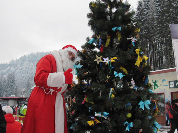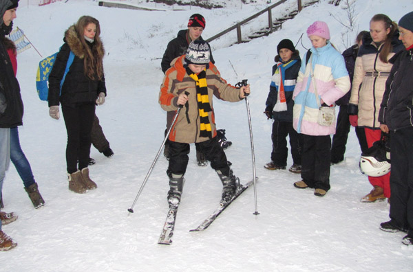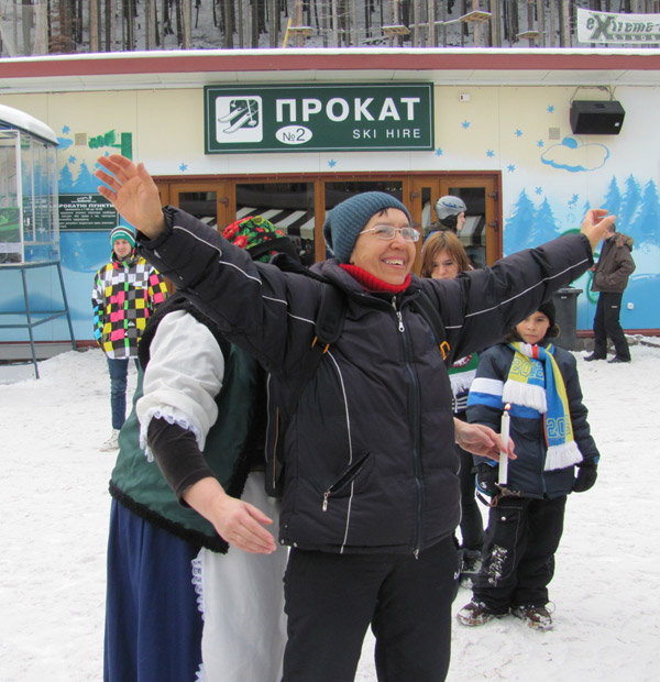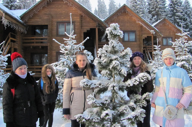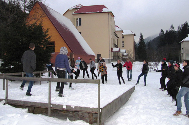 Итак, утро первого дня для катания наступило. Сначала обязательно сделали зарядку. Но не в помещении, а под открытым небом, на хрустящем снегу и под пристальным взглядом карпатских смерек. Кстати, каждое утро у нас начиналось с оздоровительной физкультуры и лёгкой пробежки.