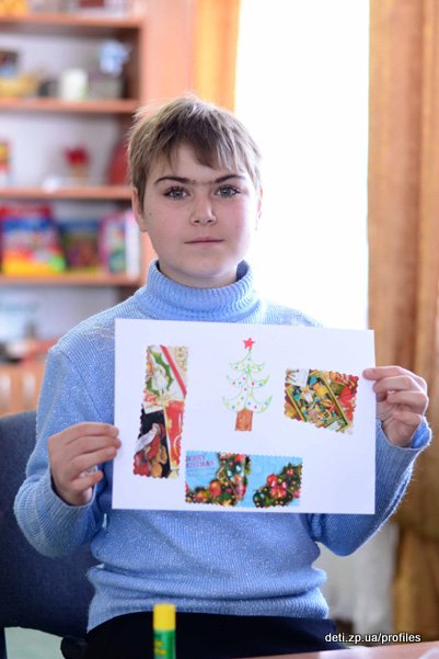 Когда смотришь на эту девочку, кажется, что она чего-то побаивается, держится немного в стороне от остальных. Даже игры не привлекли её внимания. От участия в сказке она отказалась, а когда все ребята с аниматором делали новогоднюю открытку, Танюша в сторонке тихонько рисовала.
