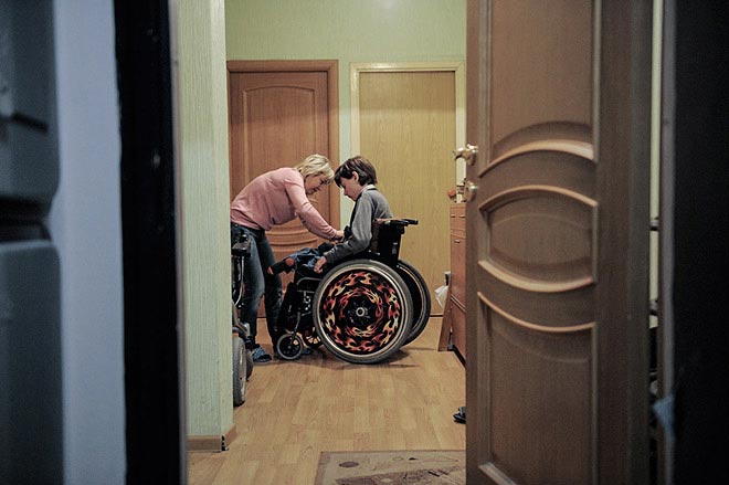 Женя живет с мамой, папой и братом. В их квартире коридоры чуть шире обычных, нет порожков и большие дверные проемы. За дверью квартиры зона комфорта заканчивается. Здесь черта, за которую большинство людей с инвалидностью не выходит: город не приспособлен для людей на колясках, поэтому их нет на улицах, а улицы не оборудуют необходимым, потому что инвалиды на улицу все равно не выходят. Замкнутый круг. Но Женя, будущий режиссер, к стереотипу о том, что человек на коляске должен сидеть дома, относится профессионально. «Юмор, особенно телевизионный, строится на стереотипах — их можно вычленить из повседневной жизни. Однажды я ехал в вагоне метро — и люди на меня выжидающе смотрели: человек на коляске, а денег не просит, как так? Когда ты сталкиваешься со стереотипами по отношению к себе, надо к этому относиться как к эпизоду из «Смехопанорамы». На этих словах Алексей, папа Жени, завозит коляску в лифт — сейчас 8.10, и мы собираемся ехать на пары в университет.