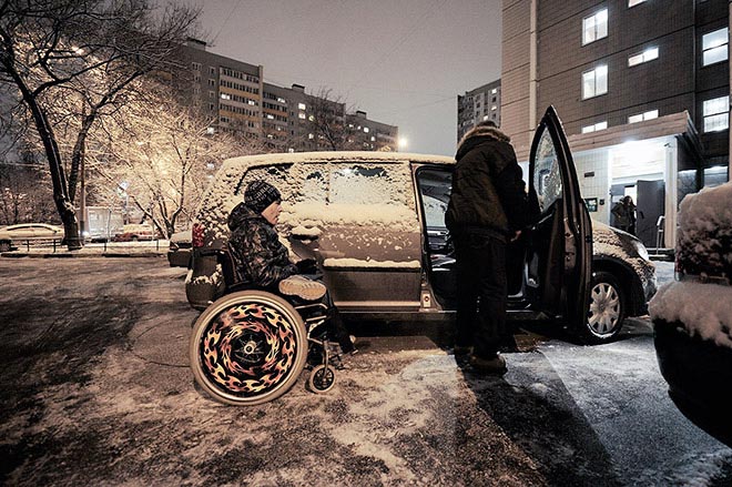 На первый взгляд, в подъезде трудностей с передвижением возникнуть не должно: всего семь ступенек, есть съезд. «Самостоятельно лестница в подъезде не преодолима, — разбивает мои иллюзии Женя. — Это же обыкновенная лестница с двумя полозьями для детских колясок. Пытаться съехать самому — это самоубийство». Алексей аккуратно свозит коляску. У подъезда — две ступеньки и пандус, его по просьбе Жениных родителей сделал муниципалитет; правда, пришлось переделывать, сначала он был слишком крутым. Вообще, пандусы, которые мы видим на улице, после установки никто не тестирует, и в большинстве случаев для инвалидов они непригодны — либо съезд опасный и неудобный, либо пандус ведет в яму, в лужу или на скользкую поверхность. Даже в хваленом парке Горького некоторыми пандусами пользоваться нельзя. По словам Жени, он передвигается только «на папе». В метро есть отдельные подъемники, но безбарьерные пространства разделены преградами, которые самостоятельно Жене не преодолеть. «На многих зданиях есть кнопка вызова специалиста, — рассказывает Женя, — но она либо не работает, либо специалиста нет. Туалеты для инвалидов если и есть, то закрыты. Нужно договариваться, чтобы вахтер убедился, что ты действительно инвалид, и пришел с ключом. Однажды я собрался в Пушкинский музей. Предварительно звоню, мне говорят, что все приспособлено. Приезжаем — а там лестница длиной как взлетно-посадочная полоса. Вся приспособленность этого здания заключается в том, что к тебе приставляют охранников, которые переносят коляску по лестнице. Я был на электрической коляске, она весит 60 килограммов. Мой подъем выглядел так: сидит Женя на кресле, и четыре раба тягают его вверх. Музей я посмотрел — хорошо, что хотя бы так, но о приспособленности тут говорить не приходится».